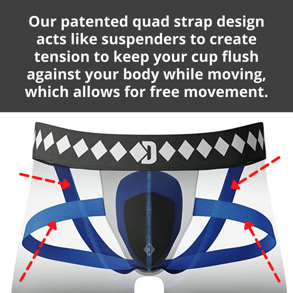 Our patented quad-strap system acts like suspenders, keeping the cup in place against your body without movement even when running, squatting, and moving at all angles.